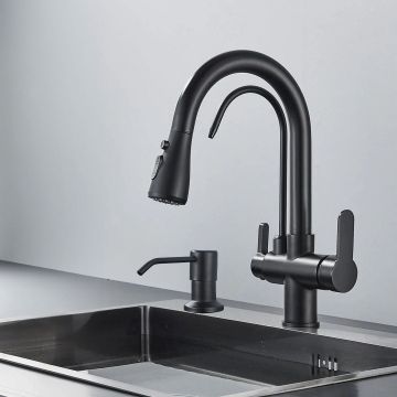 Baterie bucatarie Rea Eco Fresh, cu 3 cai pentru filtru de purificare si dus extractibil, negru mat